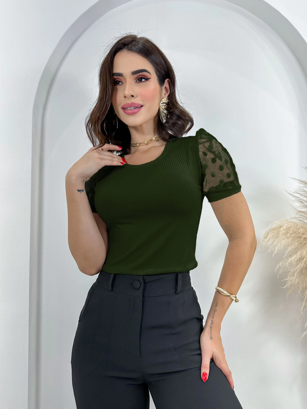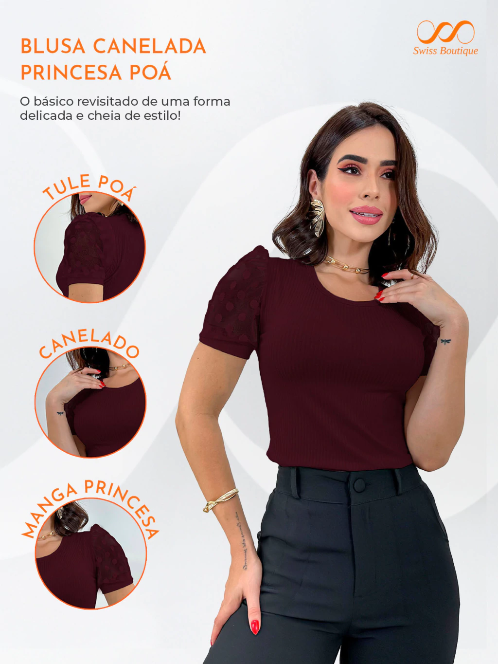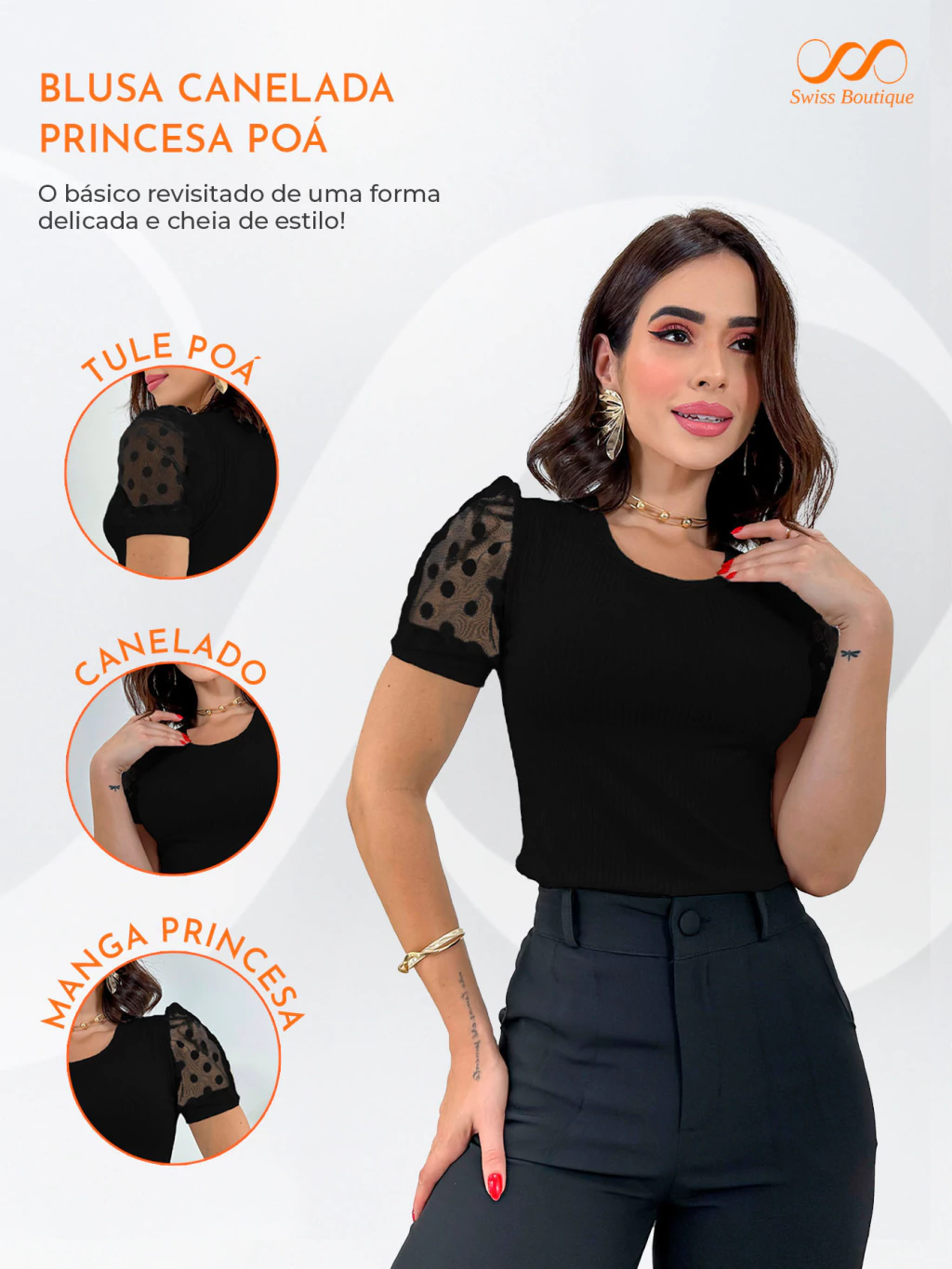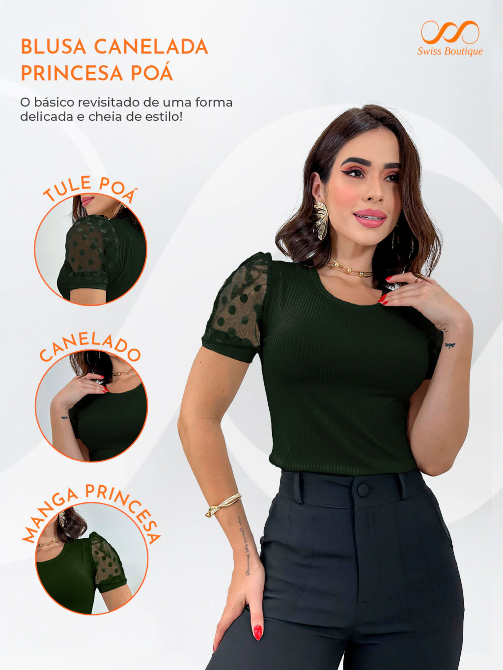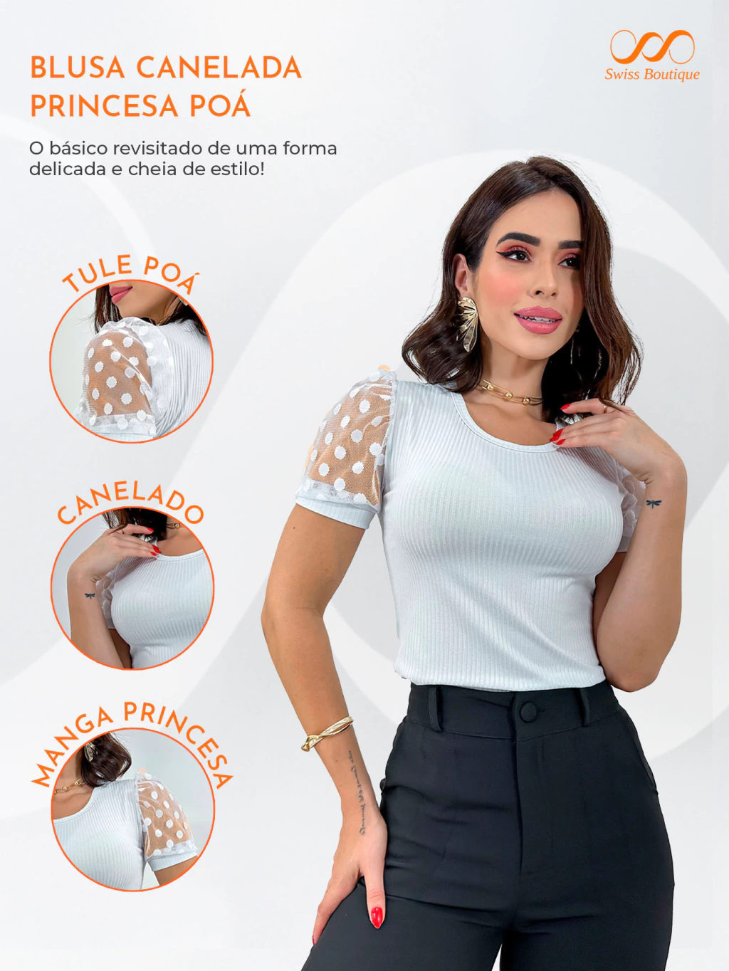 A Blusa Canelada Princesa é a união perfeita entre romantismo e estilo. Com mangas em tule poá que trazem leveza e delicadeza, sua modelagem ajustada valoriza o corpo com suavidade. Confeccionada em canelado premium, oferece conforto, respirabilidade e um toque fashion na medida certa. Ideal para compor looks femininos que equilibram o básico com charme e modernidade.