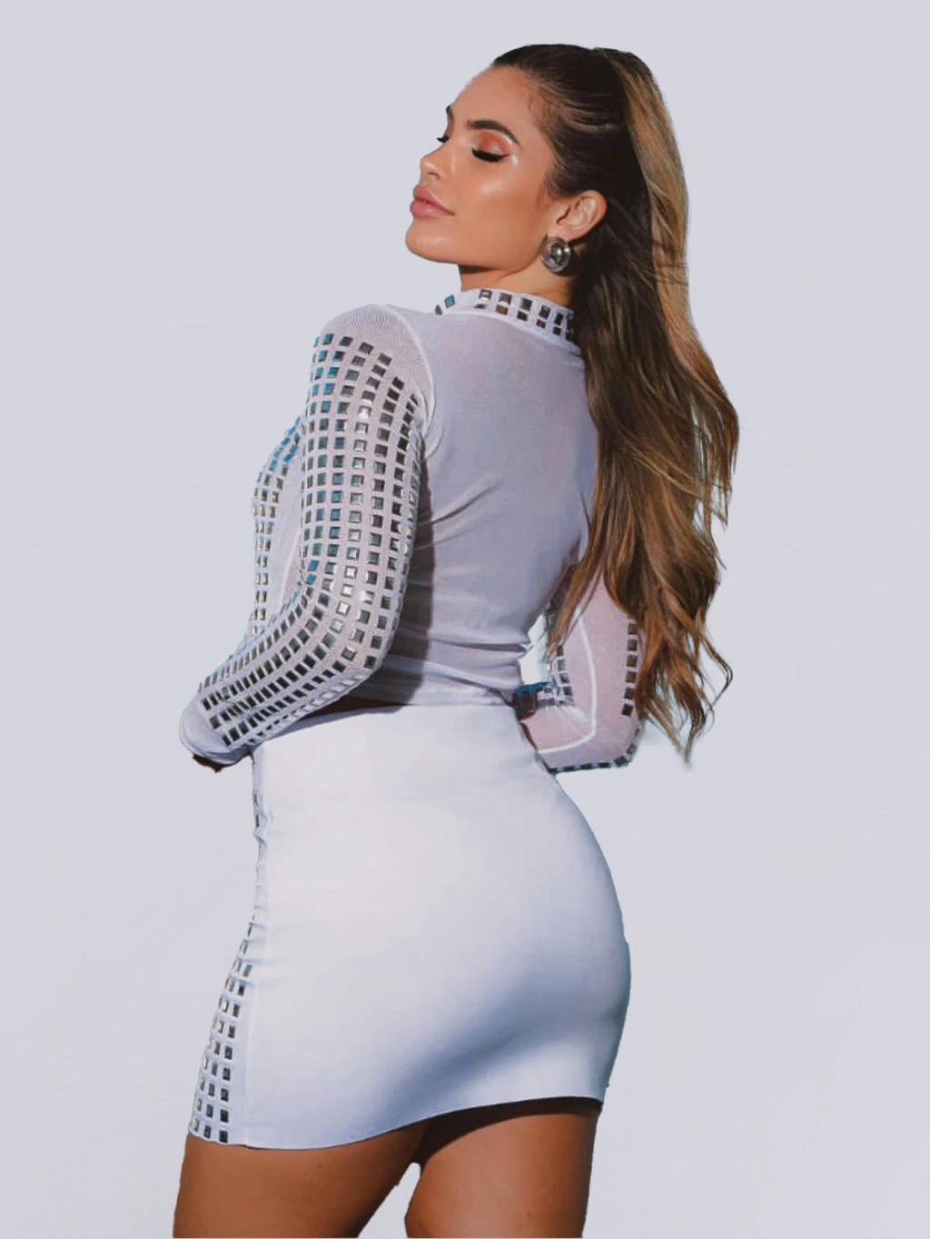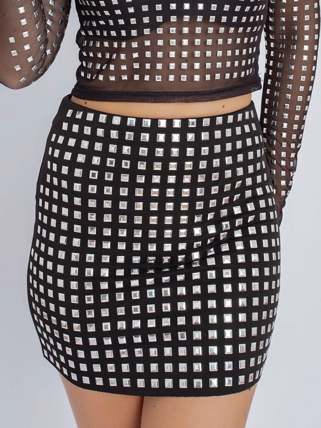 A Saia com apliques metalizado é a escolha perfeita para quem busca um visual moderno e cheio de atitude. Confeccionada em tecido encorpado de alta qualidade, apresenta modelagem curta e caimento estruturado, valorizando a silhueta. Os apliques metalizados adicionam um toque fashion e sofisticado, ideal para produções noturnas e ocasiões especiais.