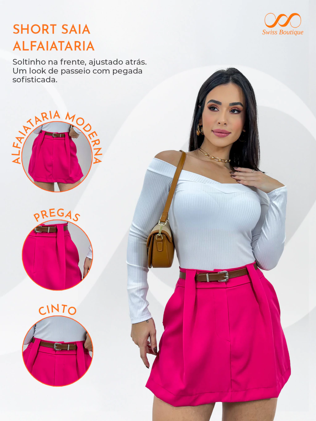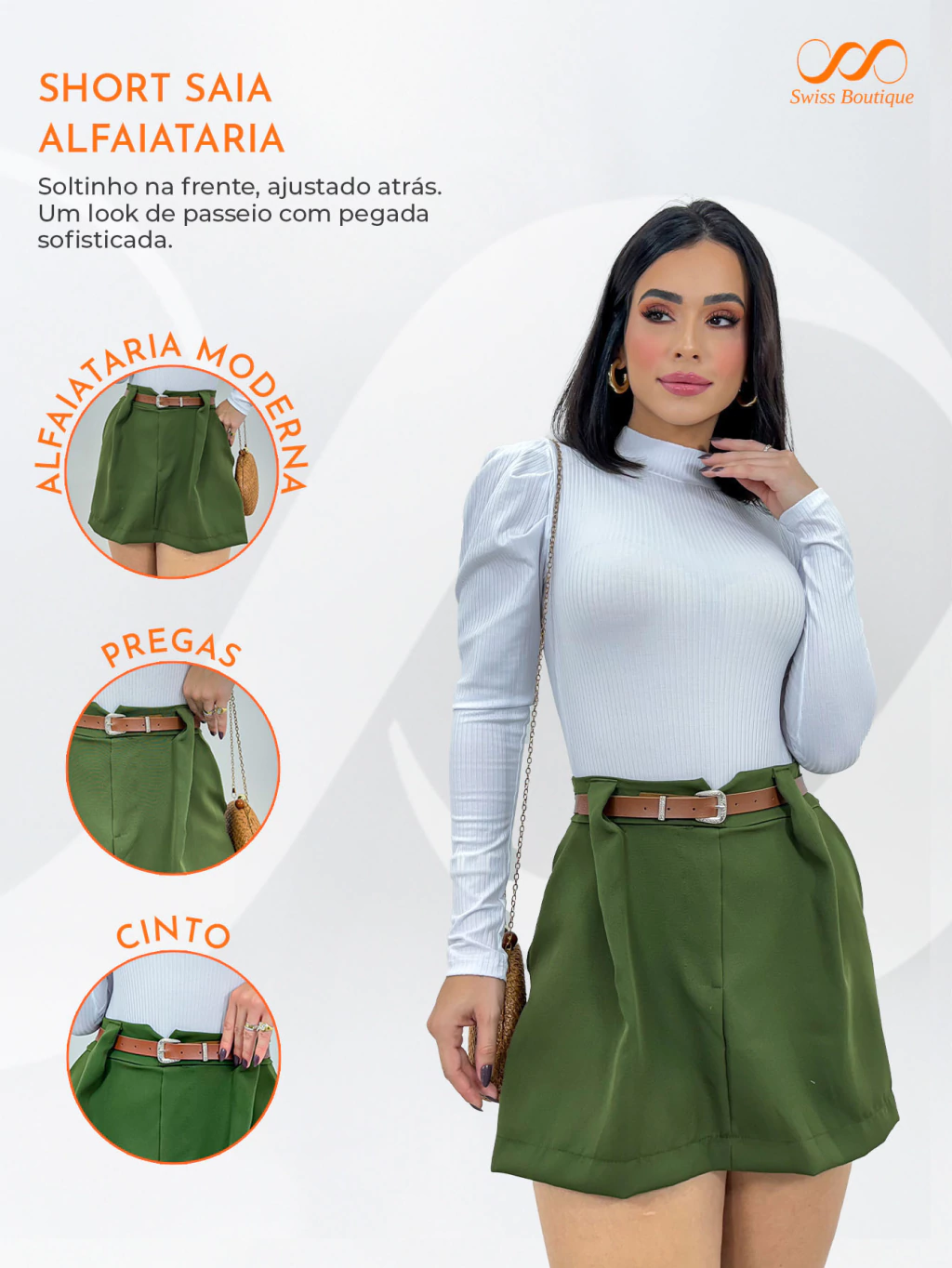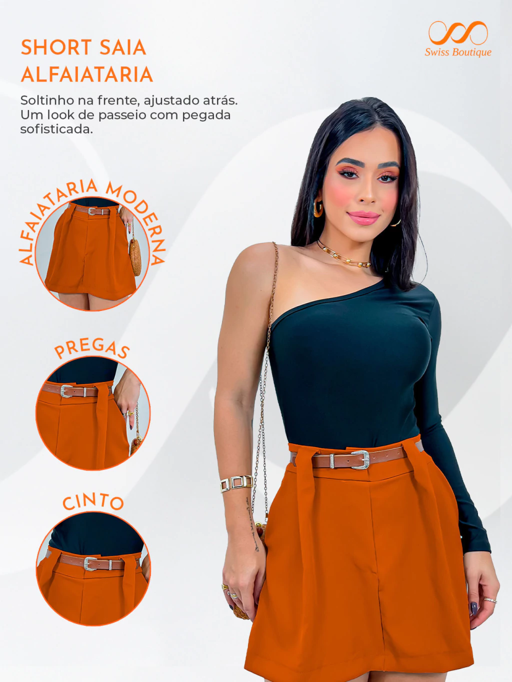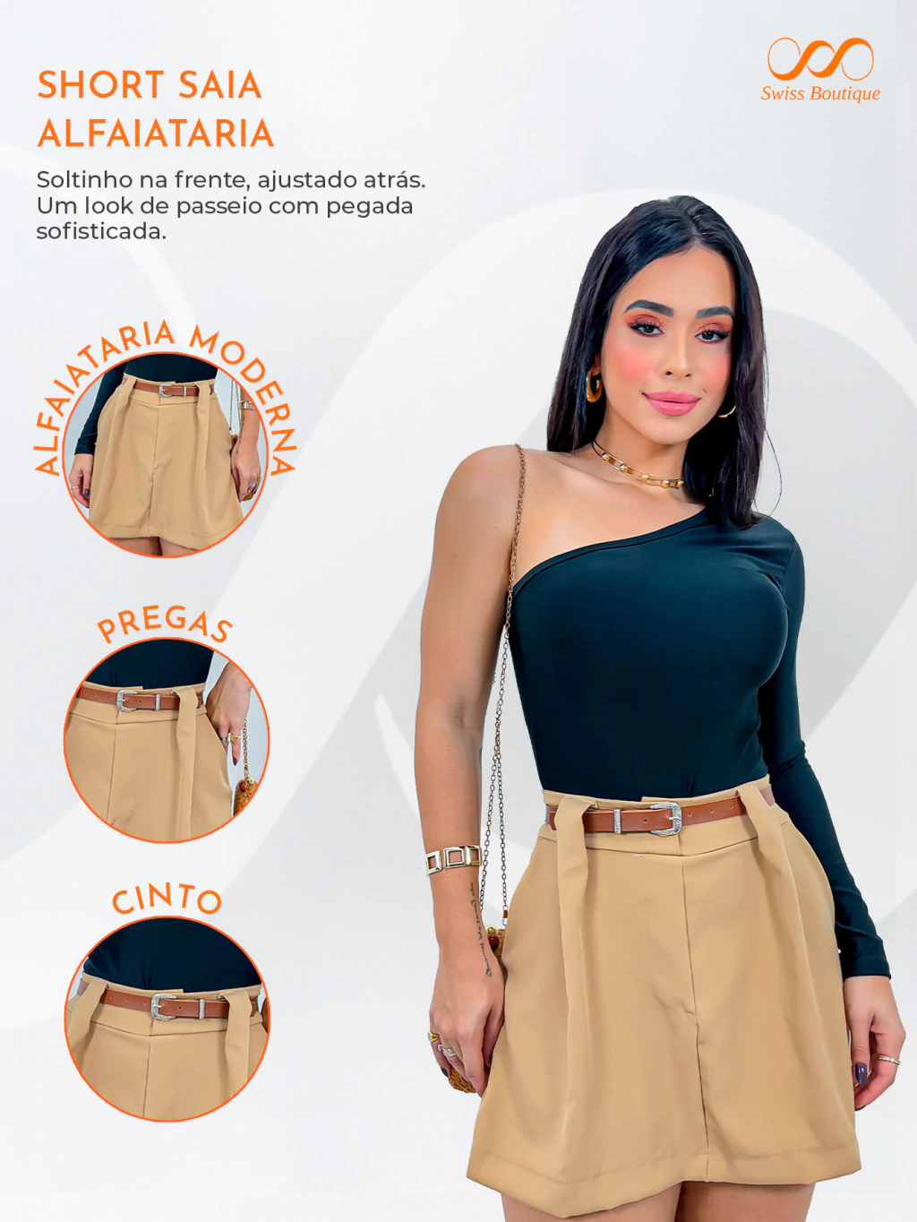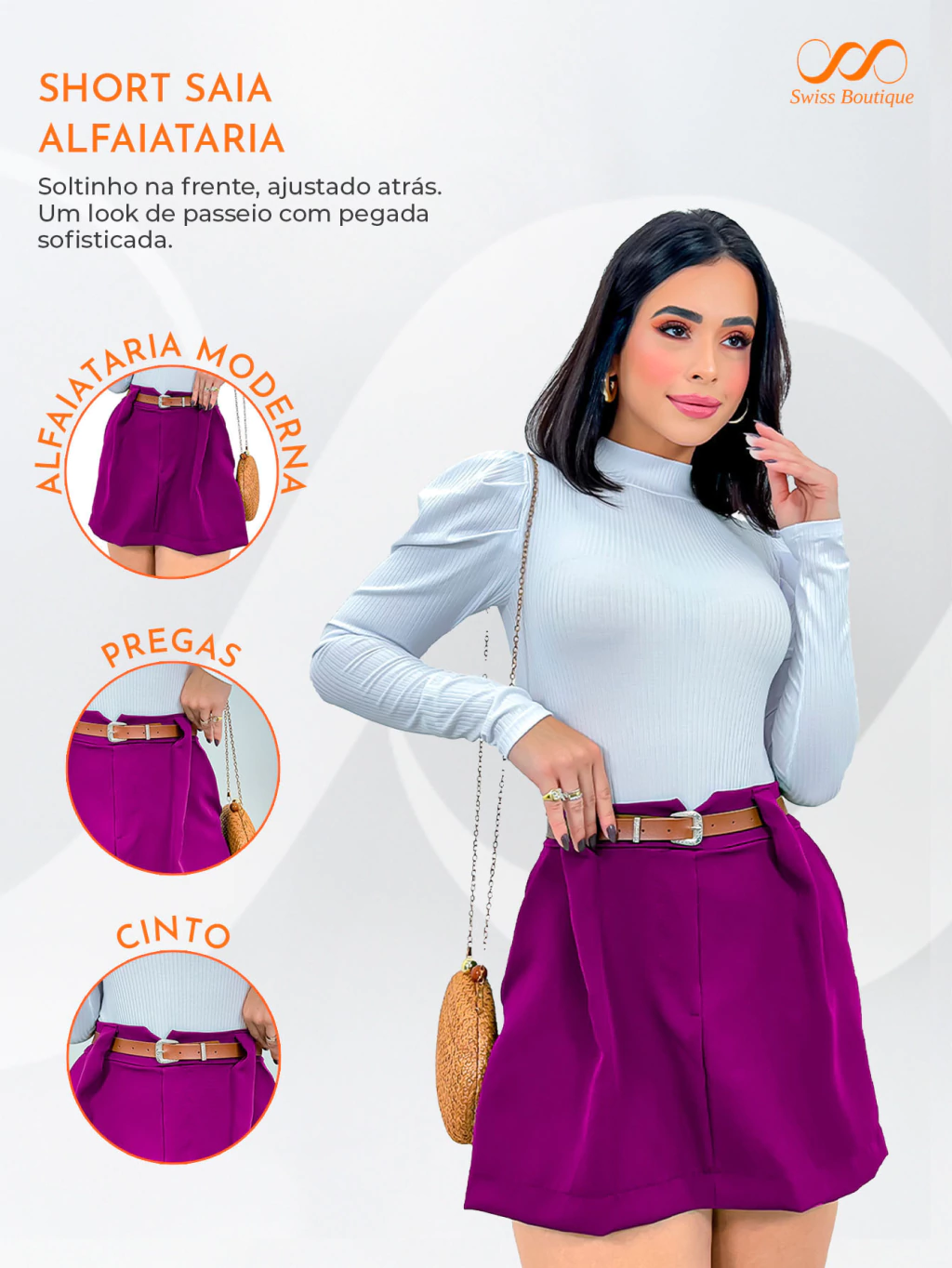 O Short Saia de Alfaiataria é a combinação perfeita entre elegância e praticidade. Com pregas frontais e cinto que valoriza a cintura, possui modelagem soltinha na frente e ajustada atrás, criando uma silhueta sofisticada sem abrir mão do conforto. Uma peça clássica com toque moderno, ideal para compor looks estilosos no dia a dia ou em ocasiões especiais.