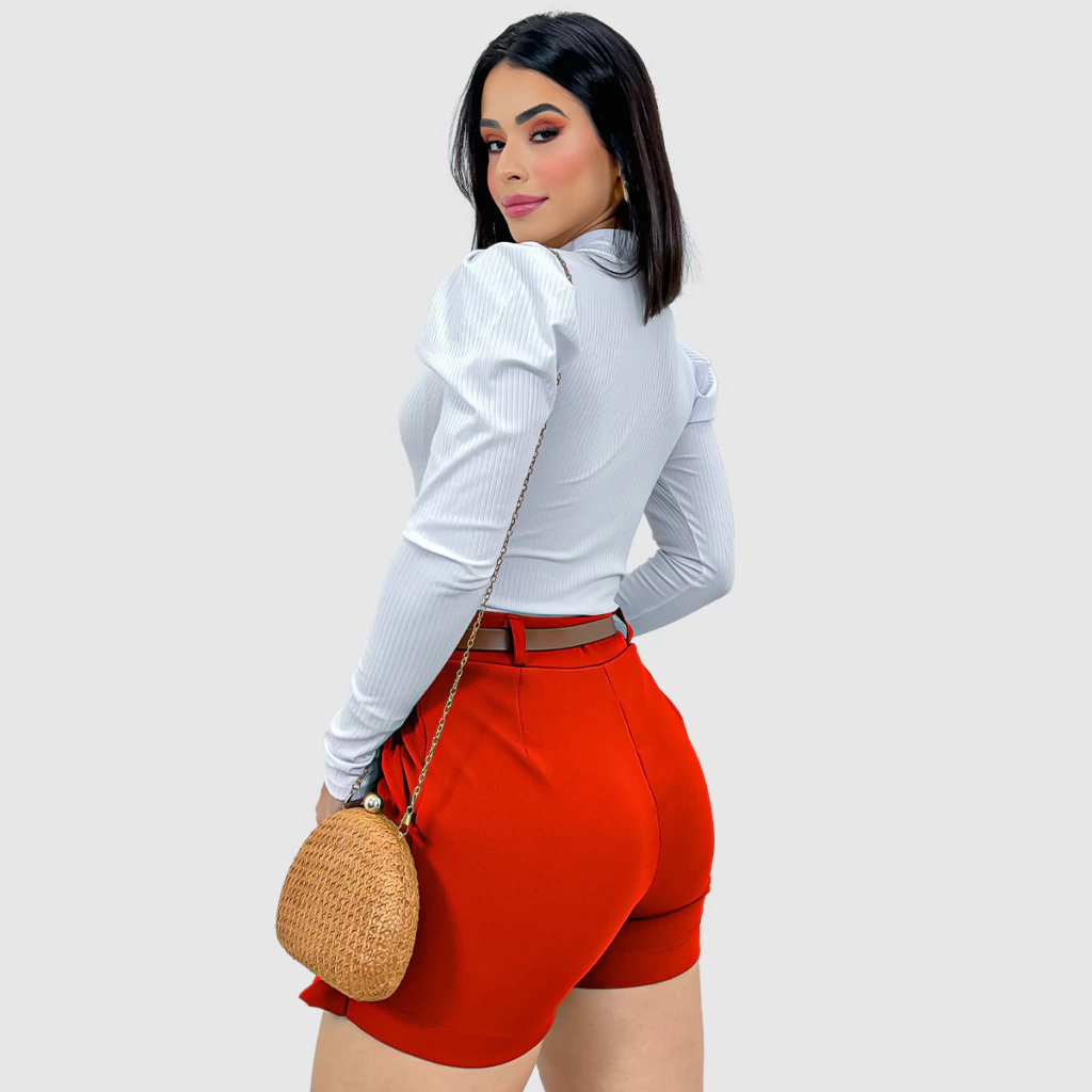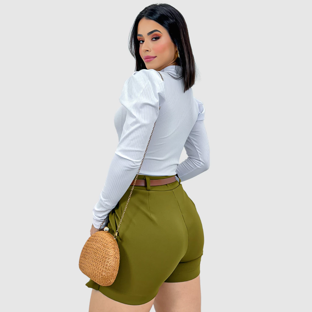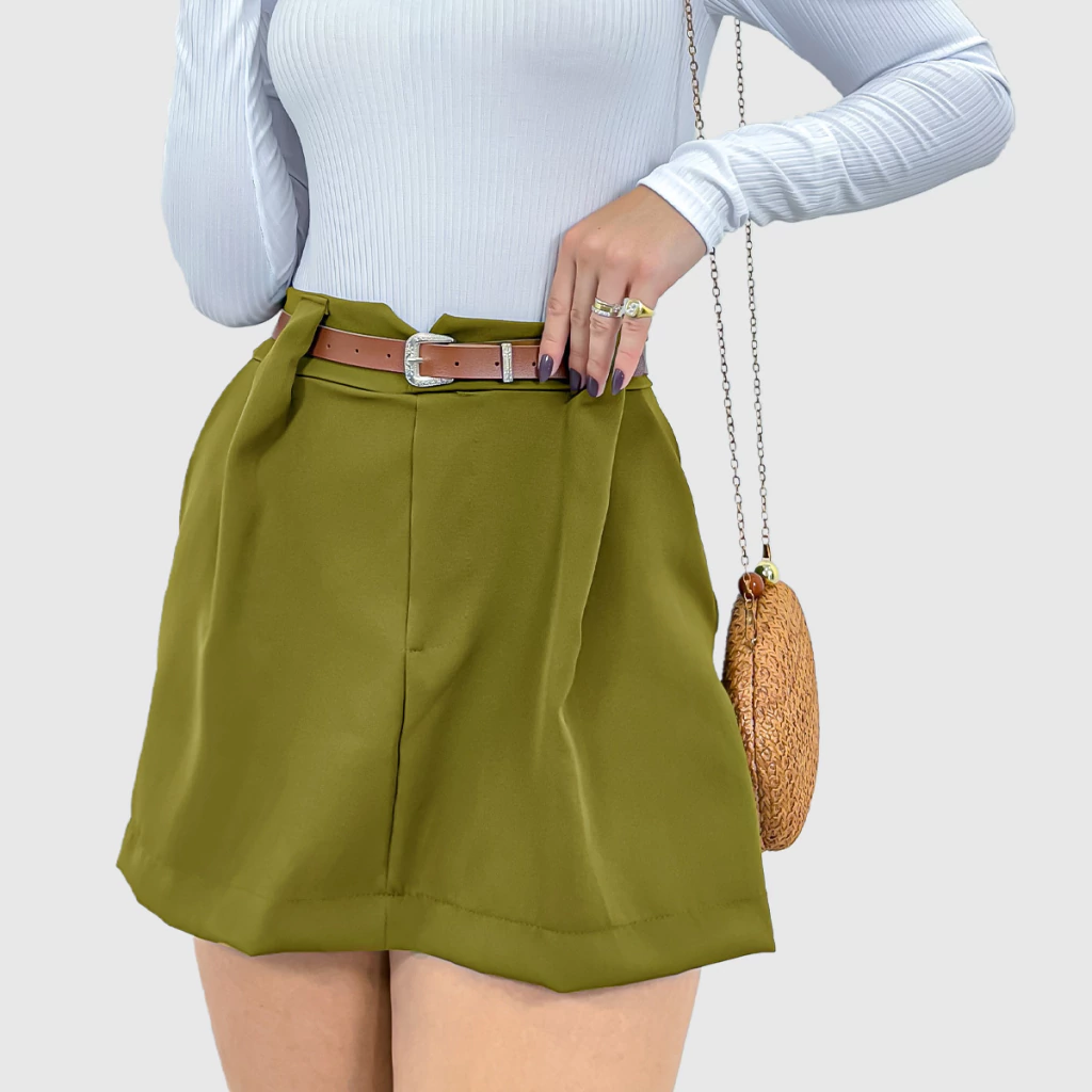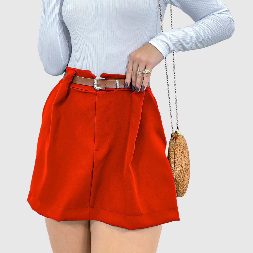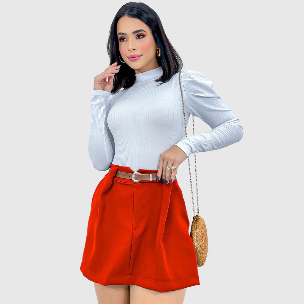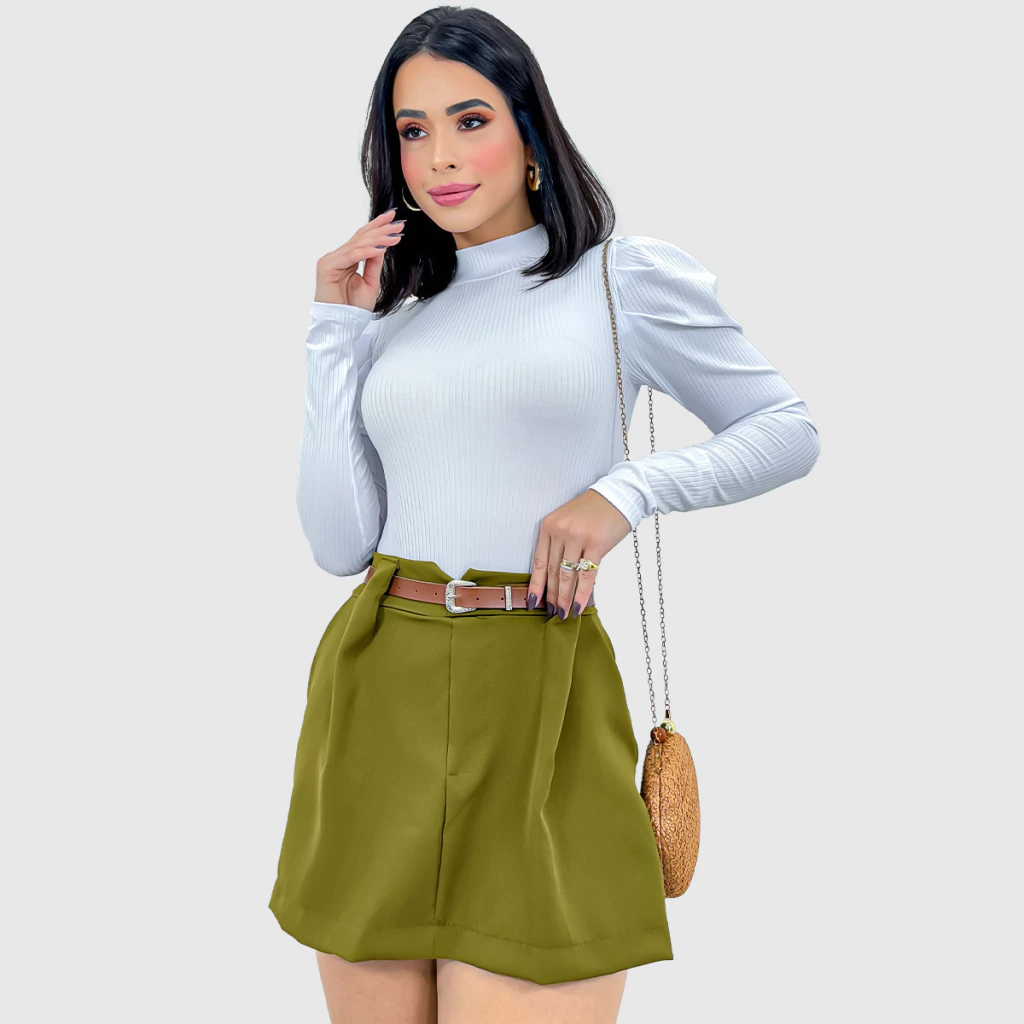 O Short Saia de Alfaiataria é a combinação perfeita entre elegância e praticidade. Com pregas frontais e cinto que valoriza a cintura, possui modelagem soltinha na frente e ajustada atrás, criando uma silhueta sofisticada sem abrir mão do conforto. Uma peça clássica com toque moderno, ideal para compor looks estilosos no dia a dia ou em ocasiões especiais.